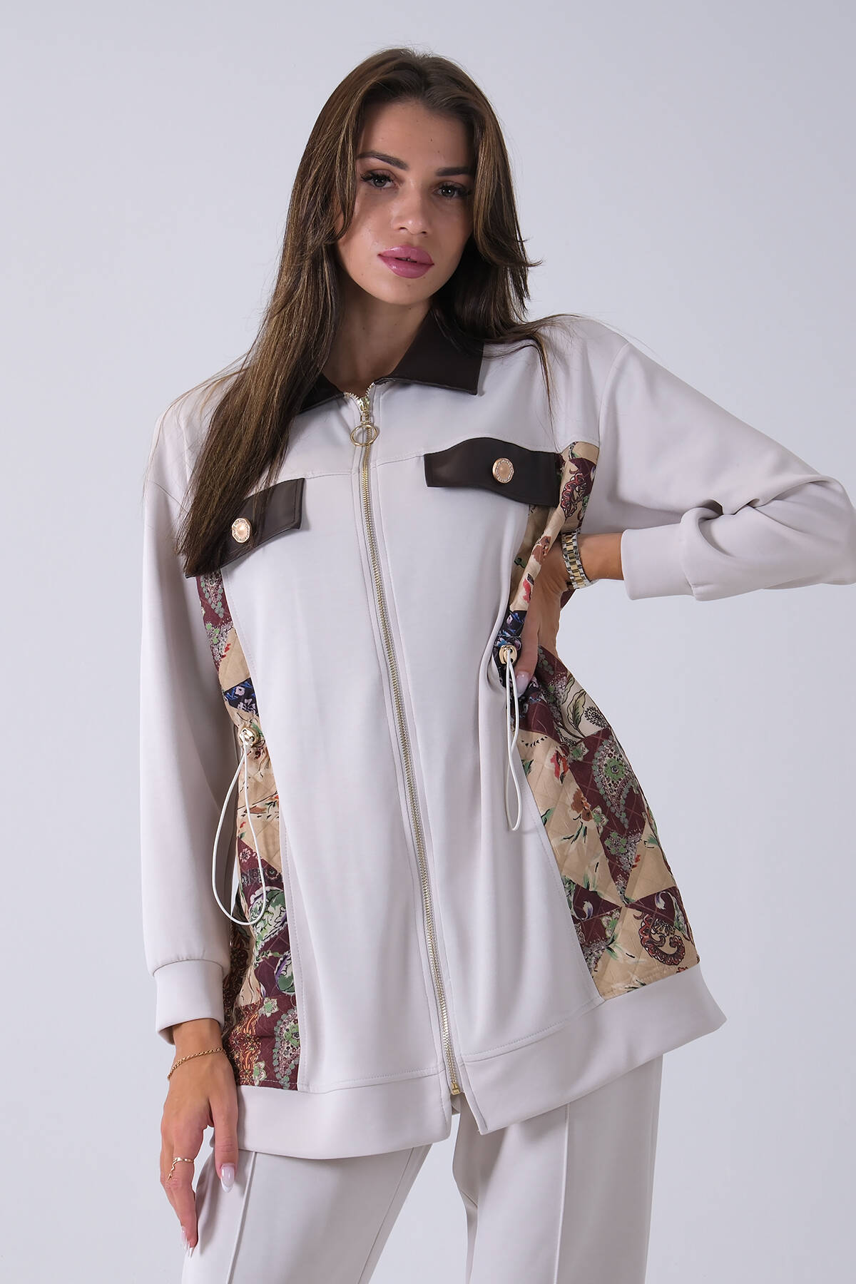 Gri Üzeri Desenli Yaka Deri Detaylı Fermuar Kapamalı Tunik Pantolonlu Takım 4703058.06