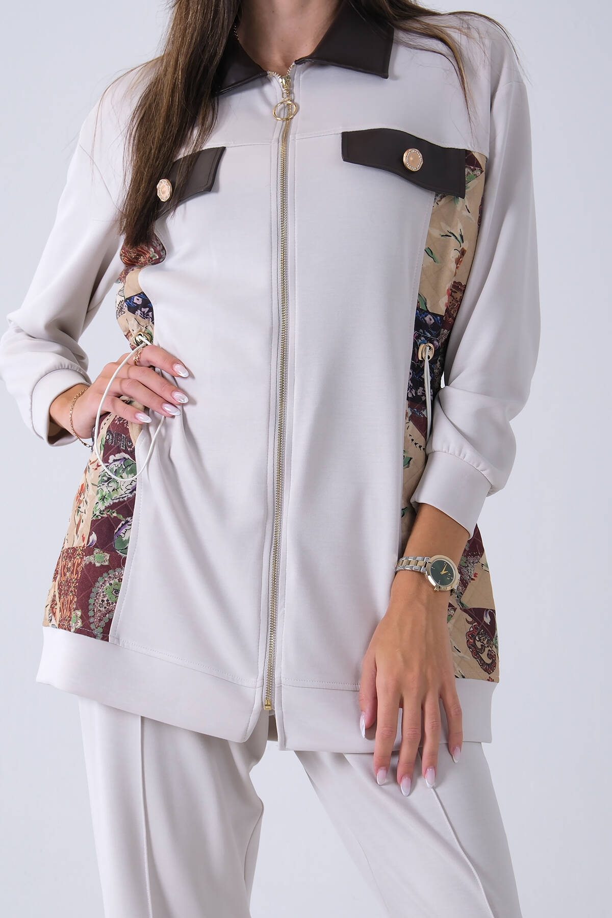 Haki Üzeri Desenli Yaka Deri Detaylı Fermuar Kapamalı Tunik Pantolonlu Takım 4703058.23