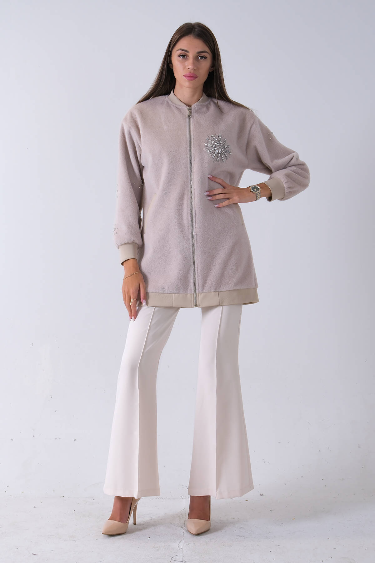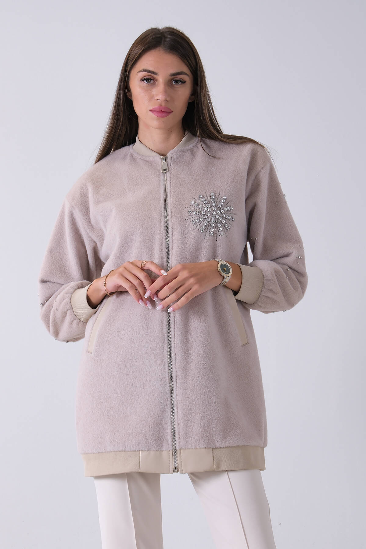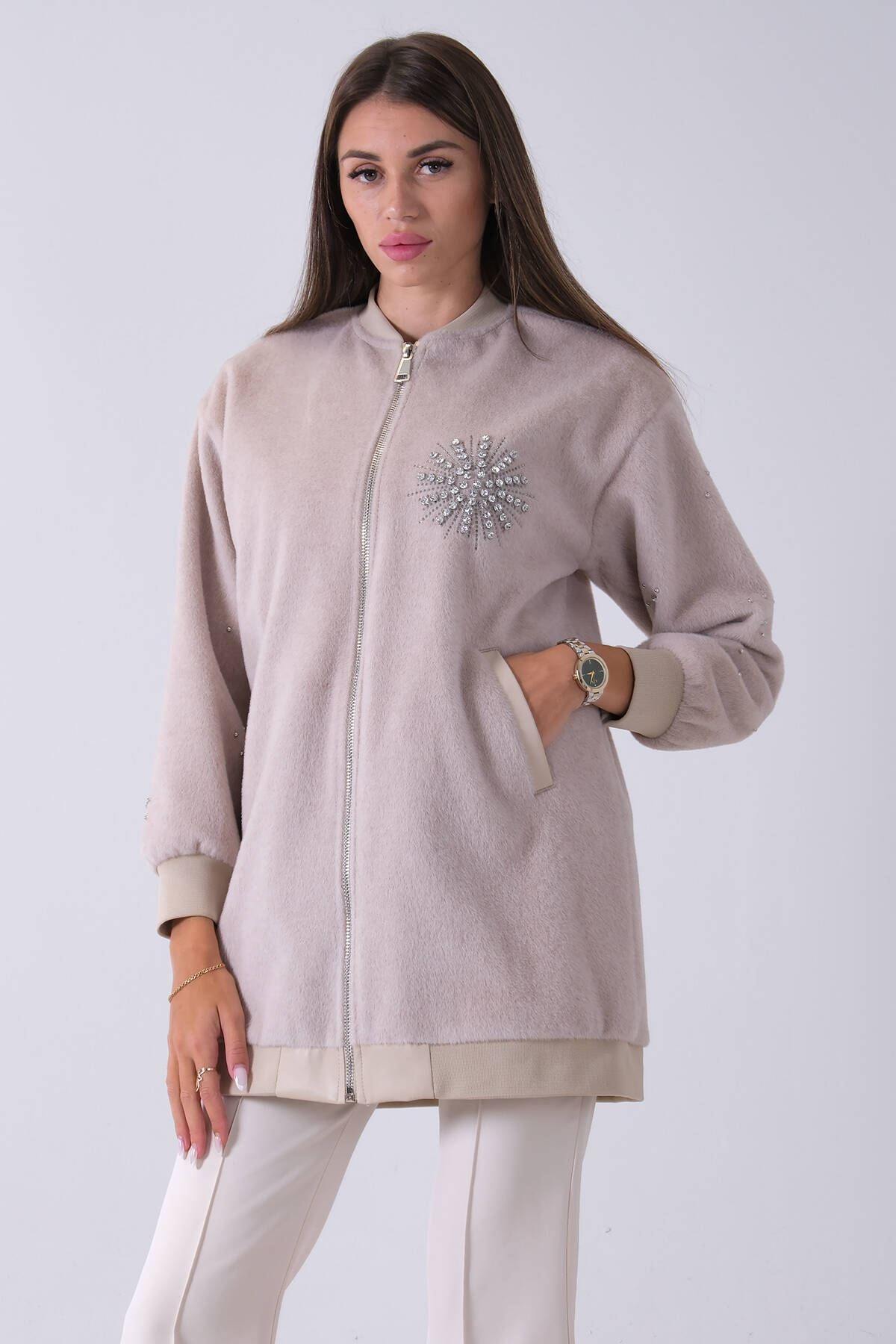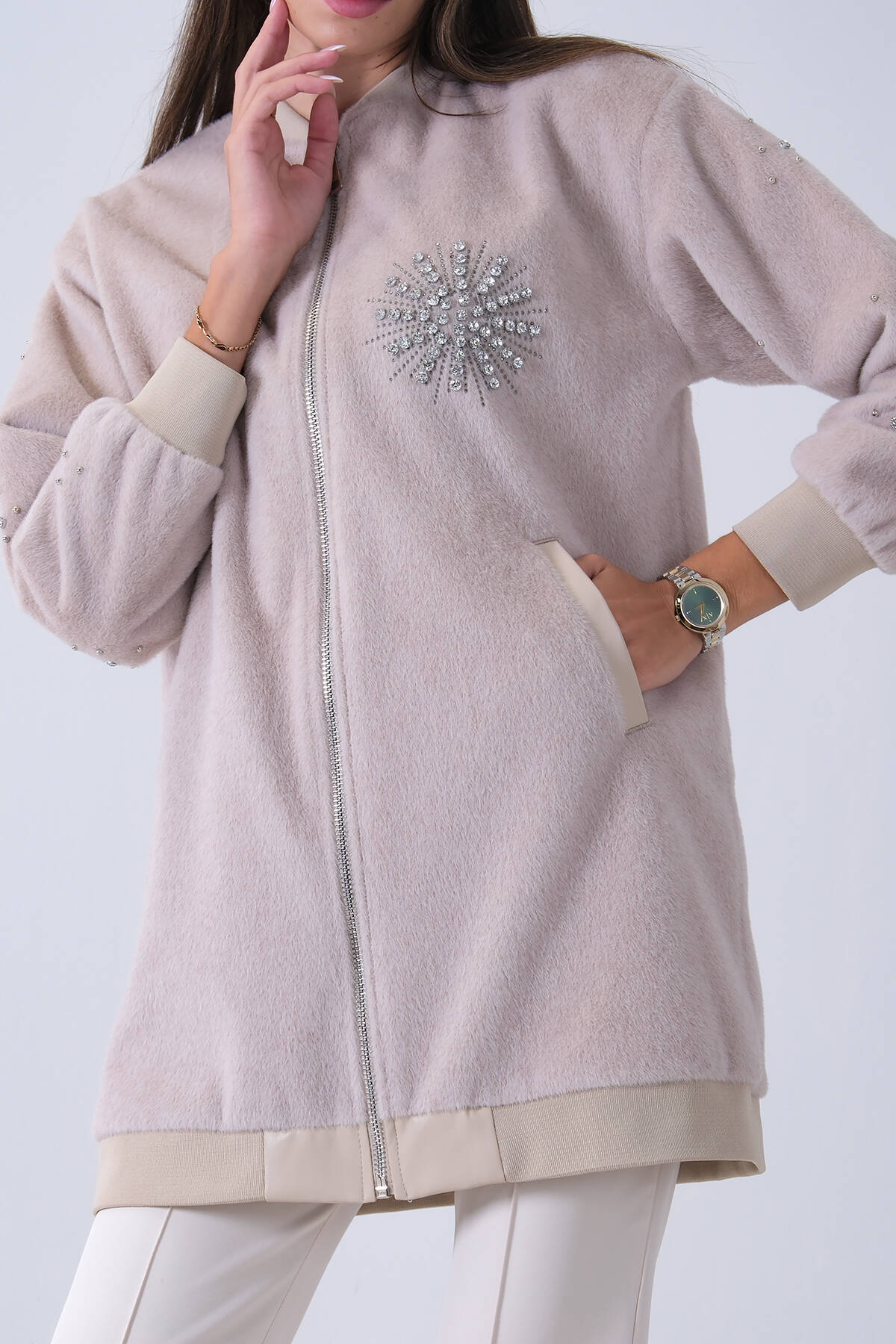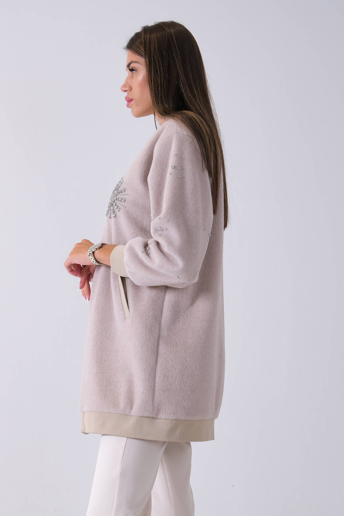 Taş Üzeri Taş Detaylı Yandan Cepli Peluş Hırka 4701420.50