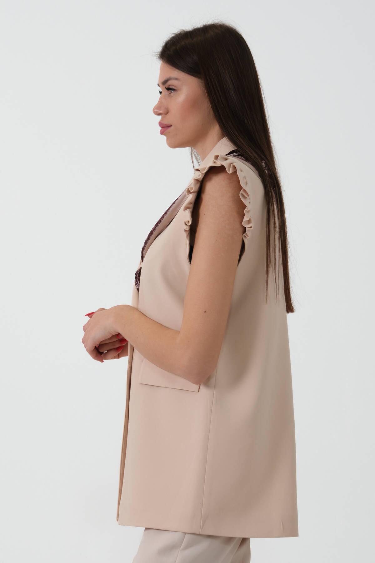 Ekru Yakalı Cepli 2 Düğmeli Kemer Bağlamalı Kaşe Yelek 5307107.147