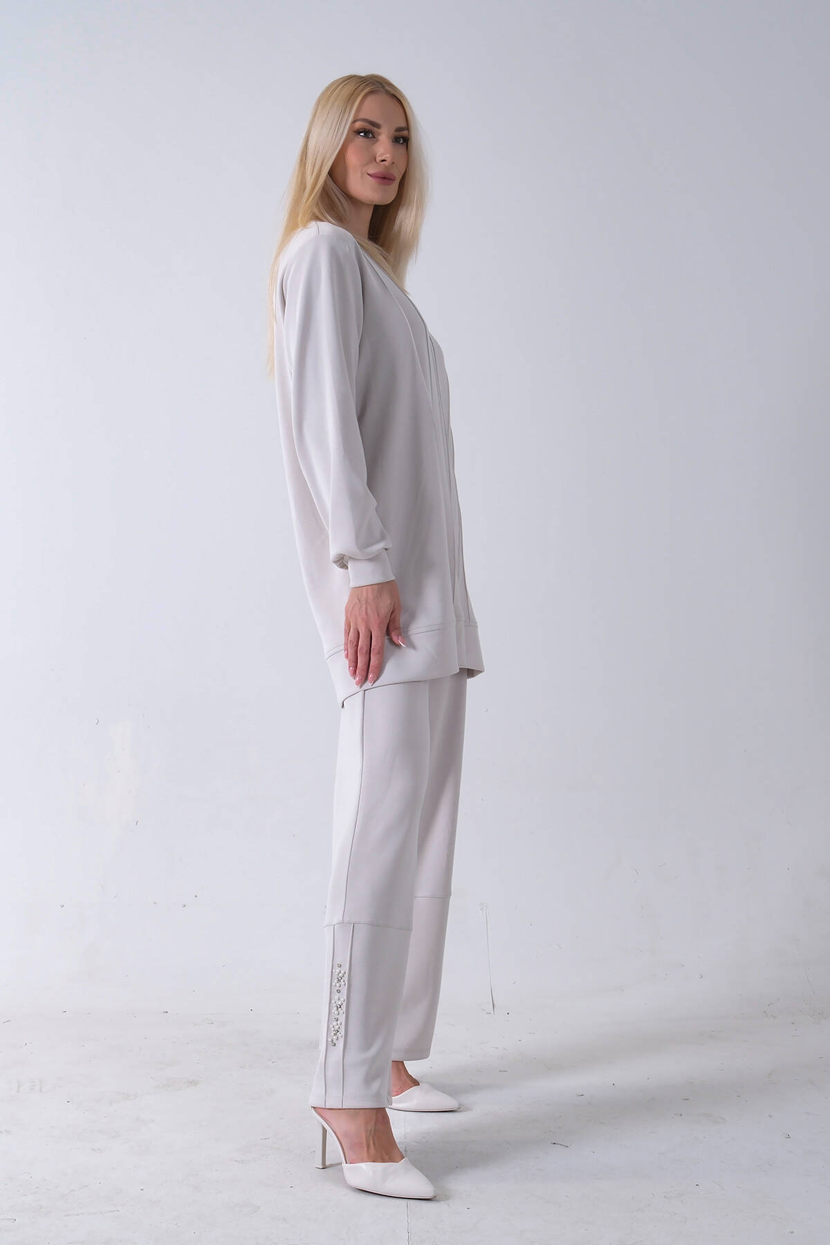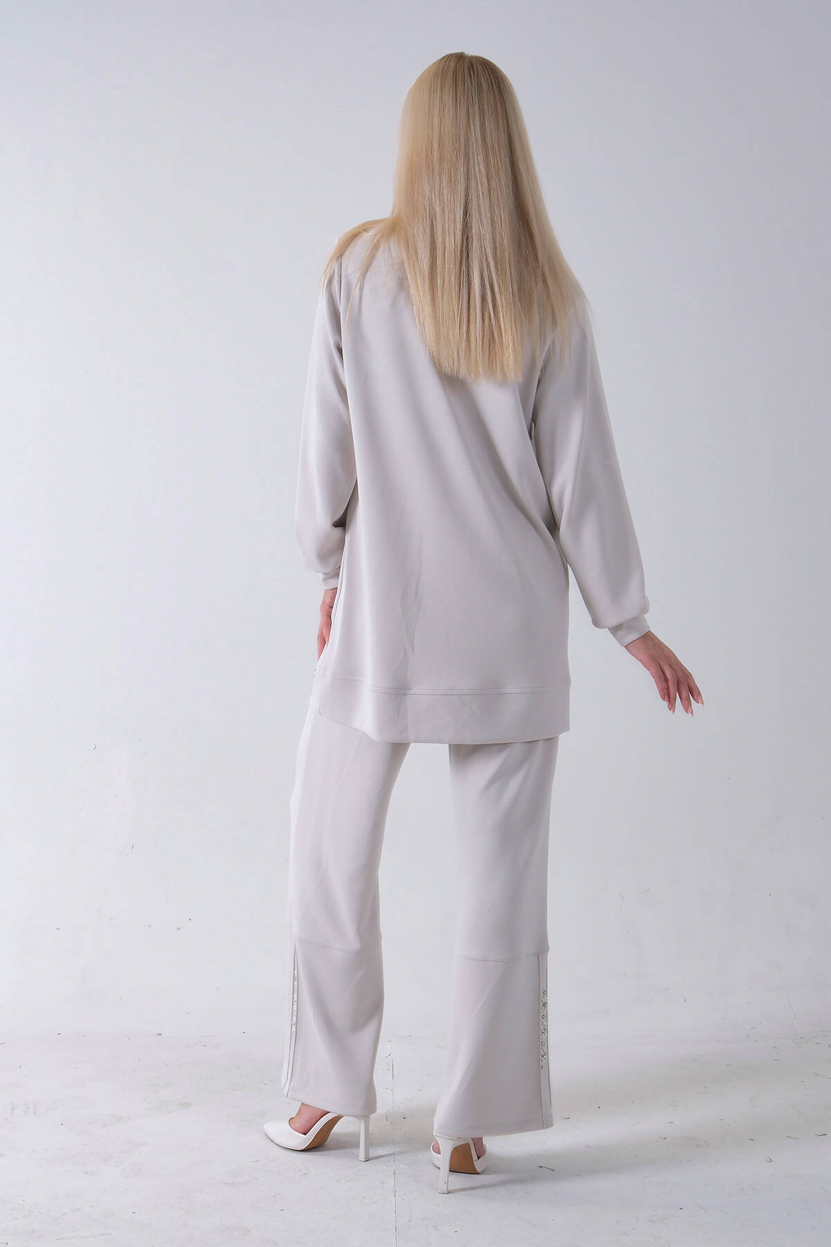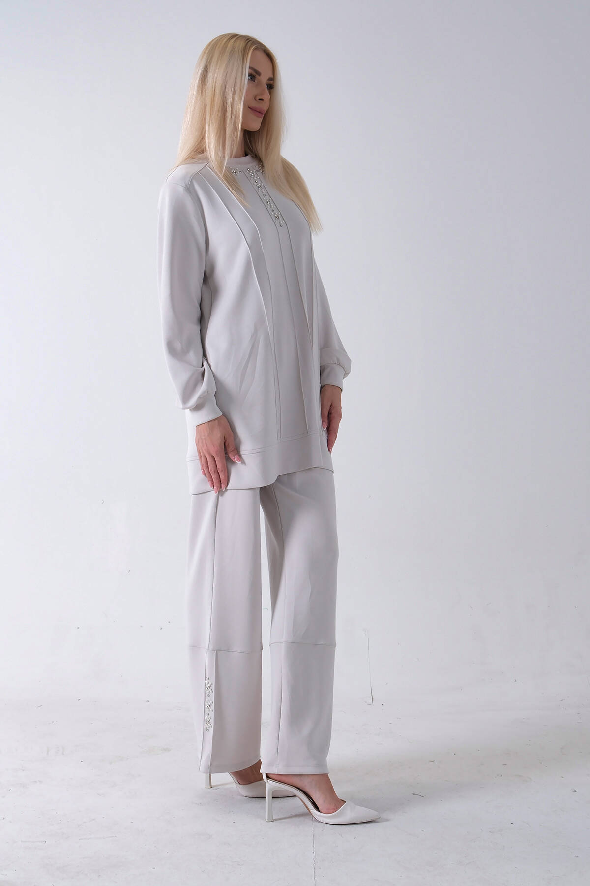 Gri Yaka ve Pantolon Paçası Taş Detaylı Tunikli Takım 4703048.06