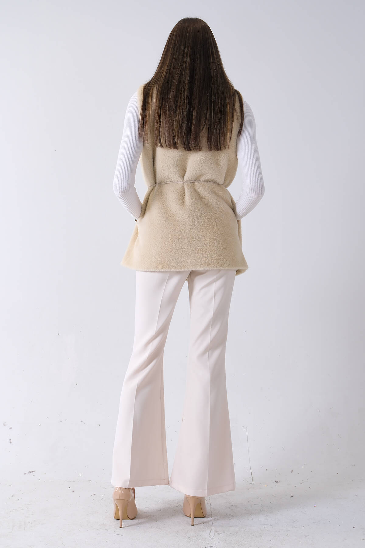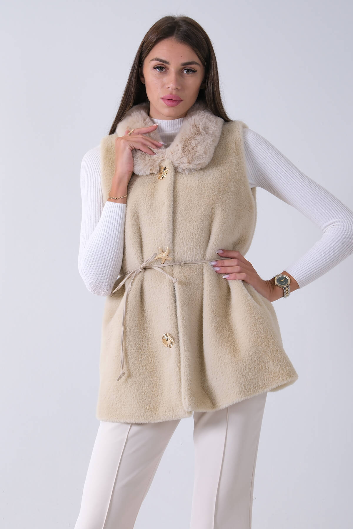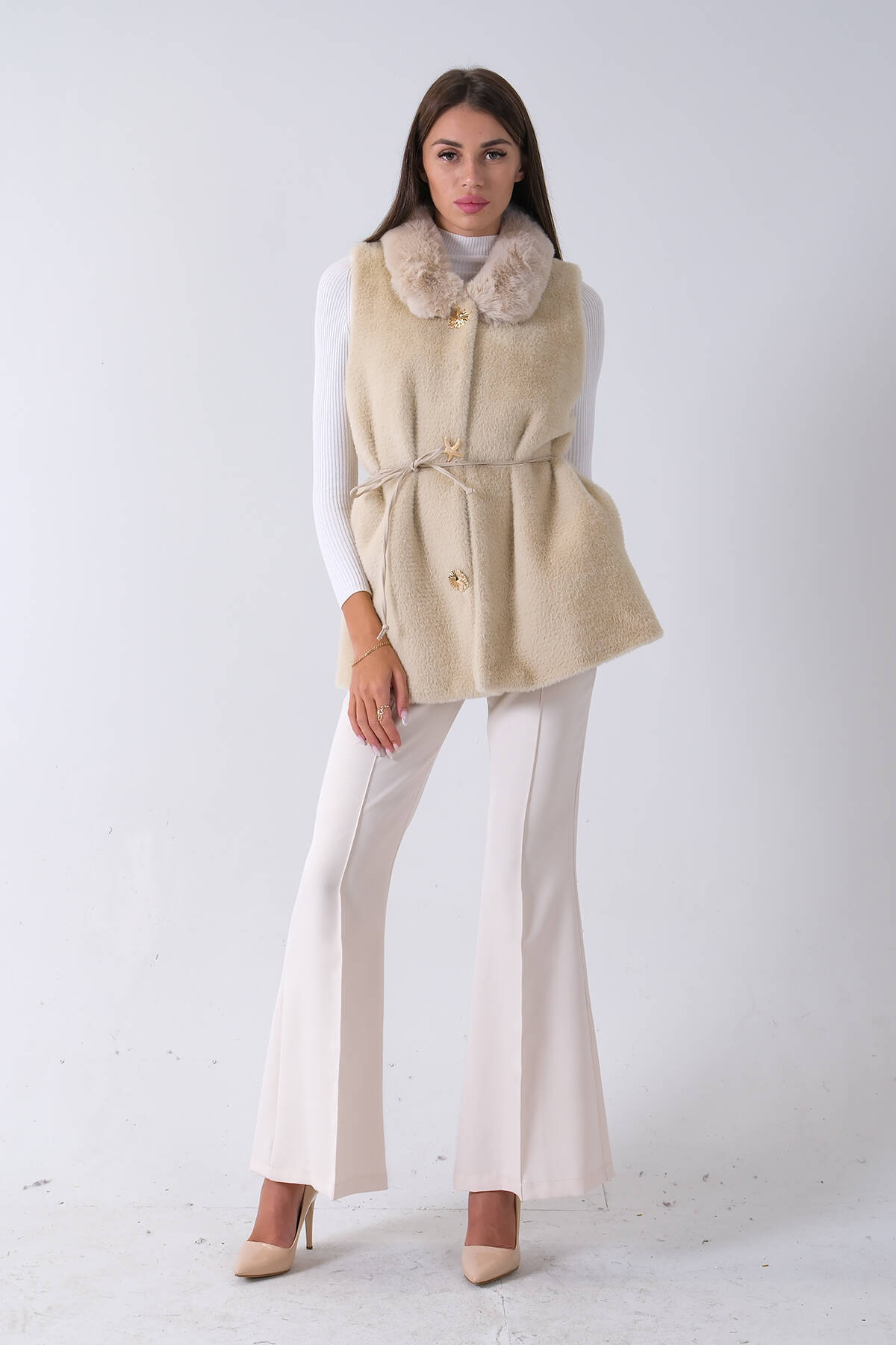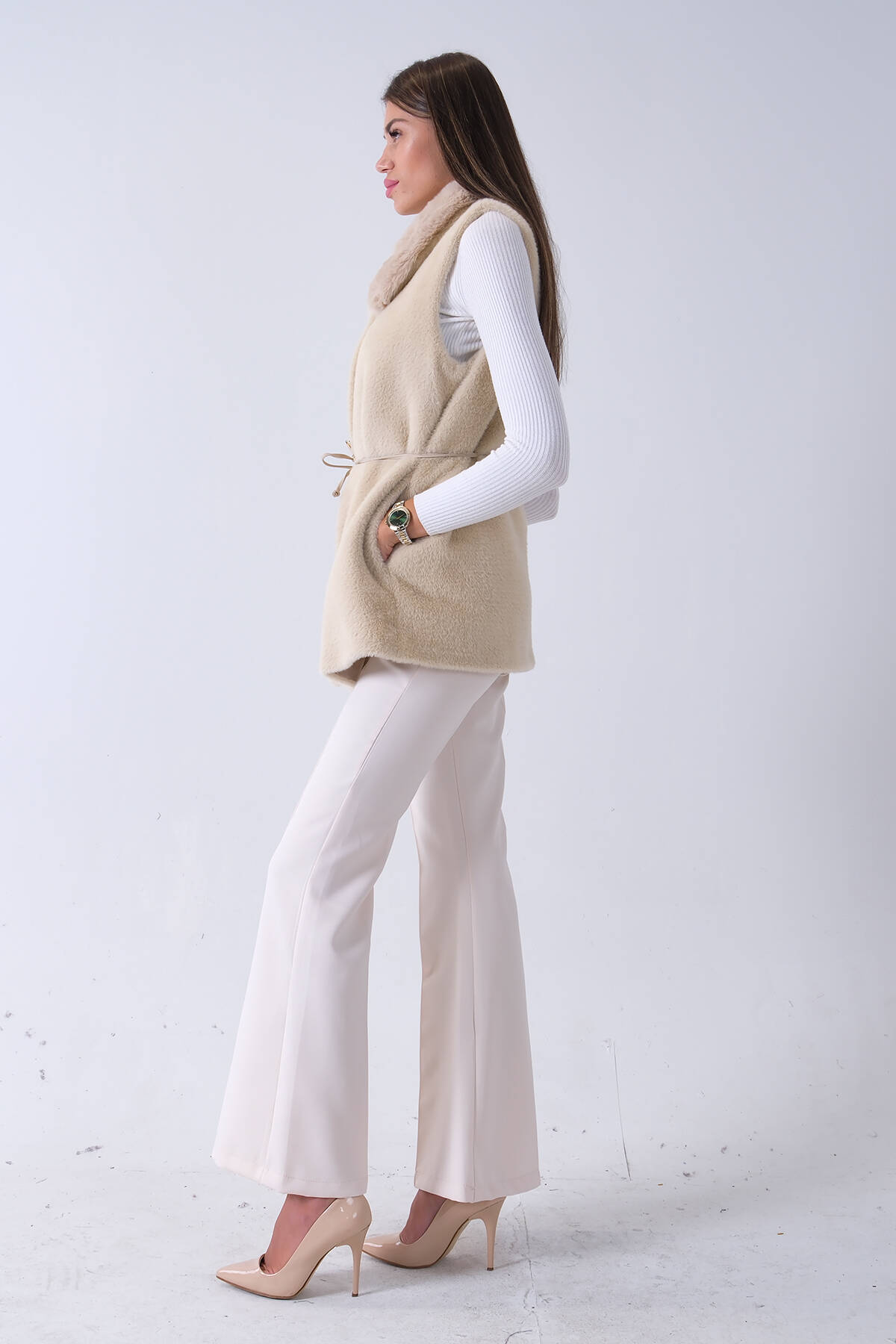 Ekru Yakalı Cepli 2 Düğmeli Kemer Bağlamalı Kaşe Yelek 5307107.147