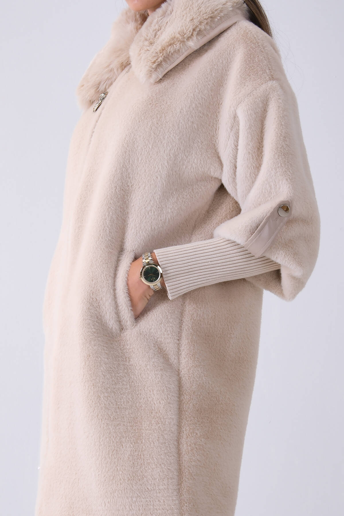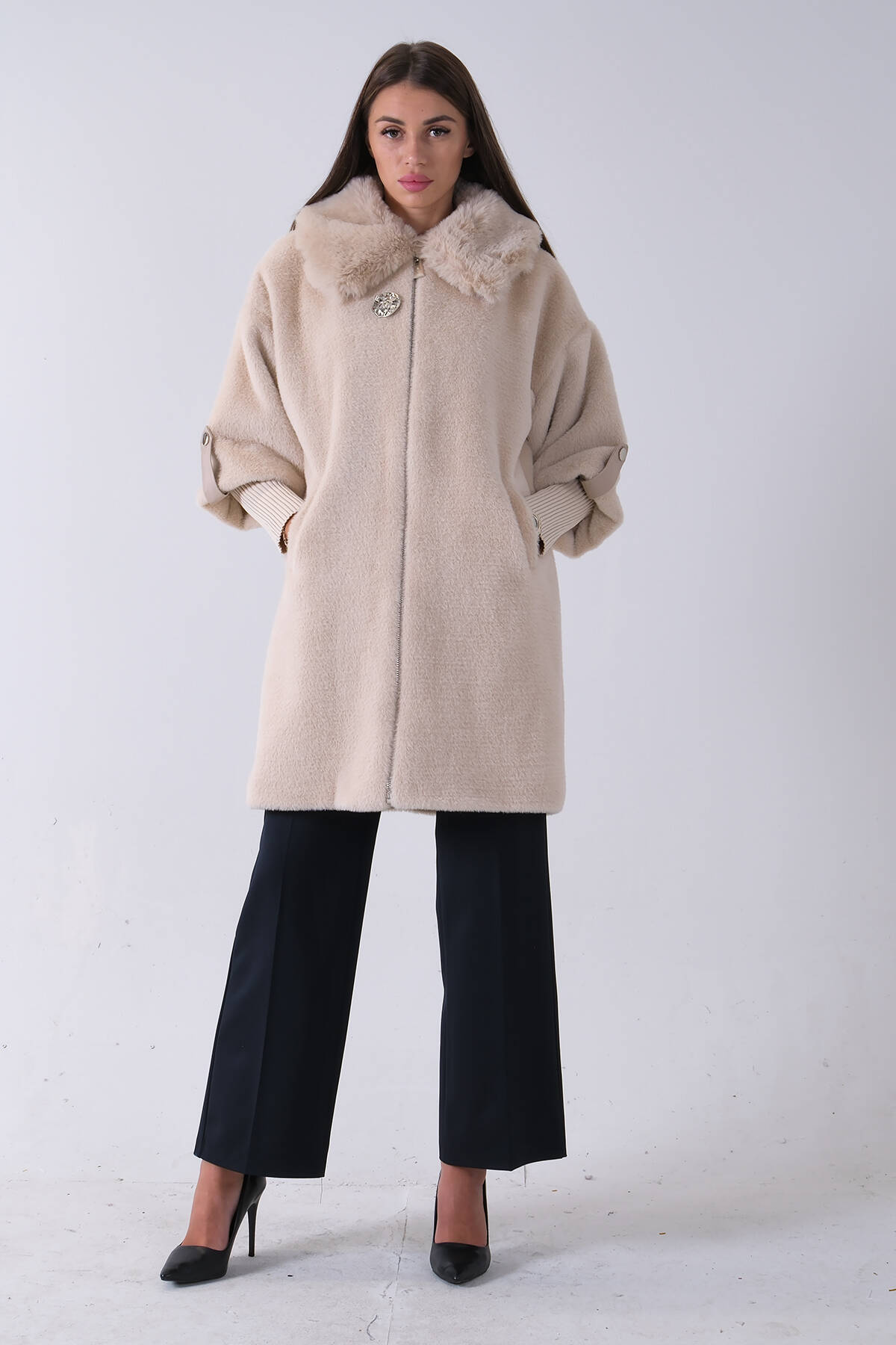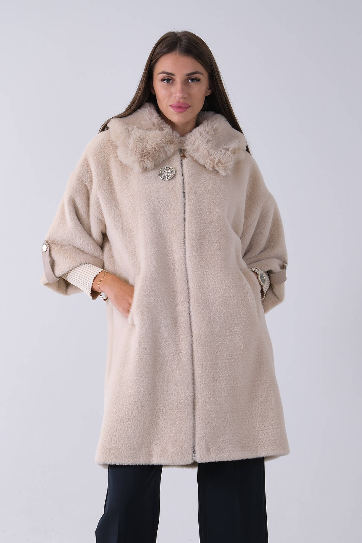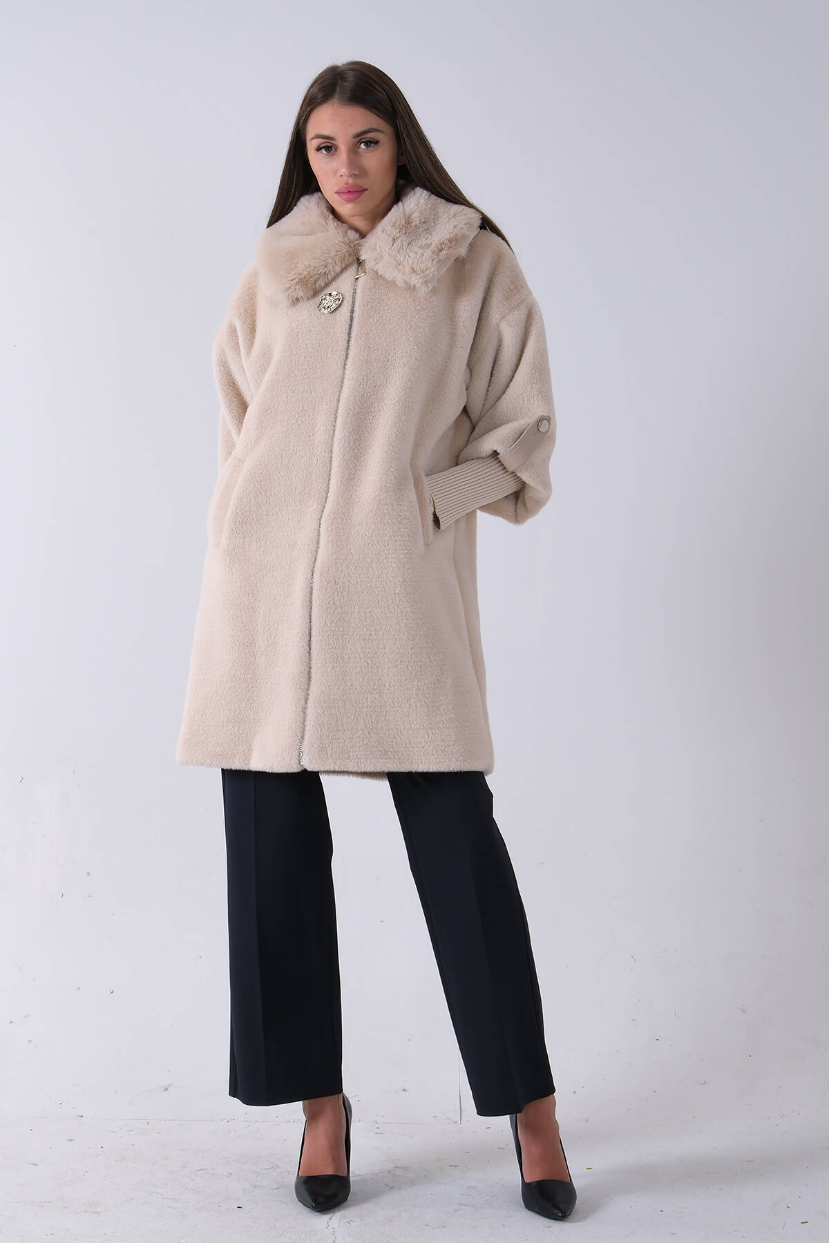 Taş Yandan Cepli Broş Detaylı Yaka Kürklü Peluş Kaban 44510847.50