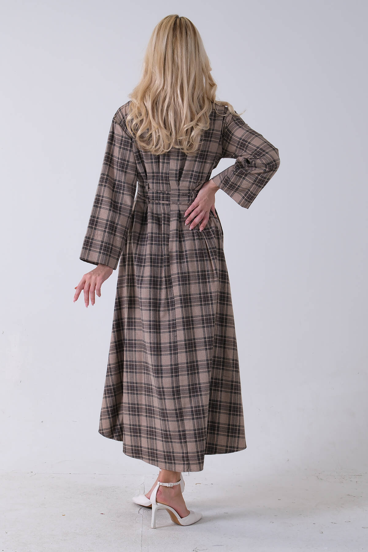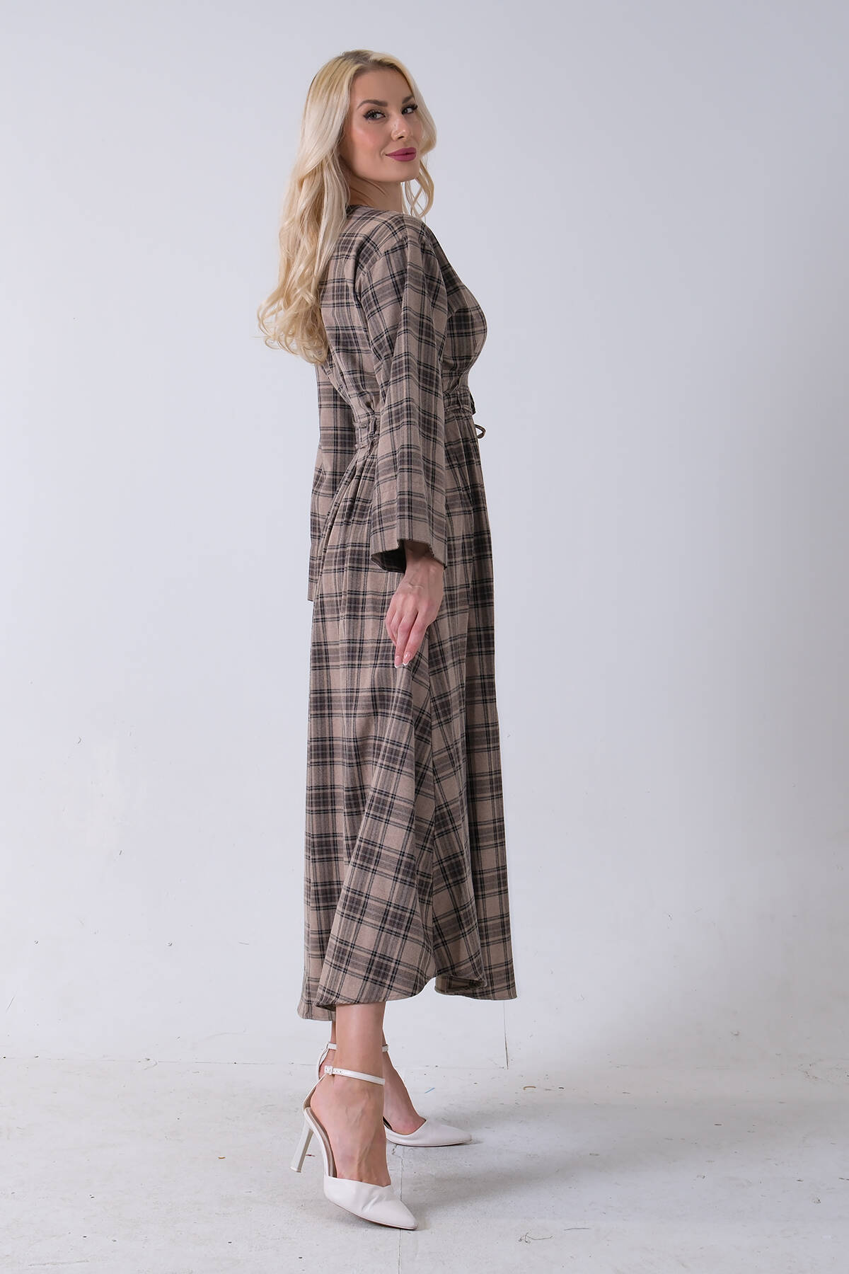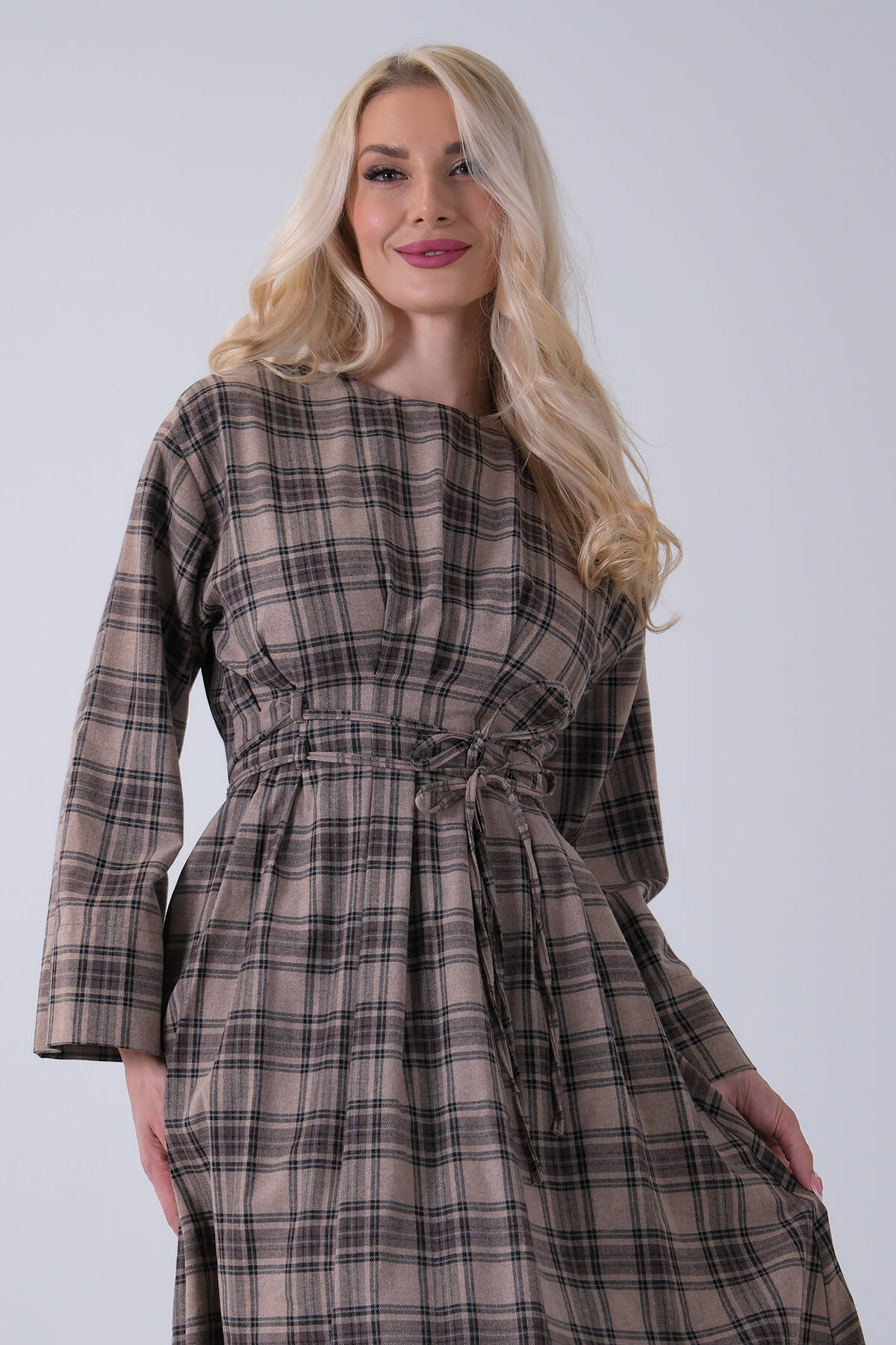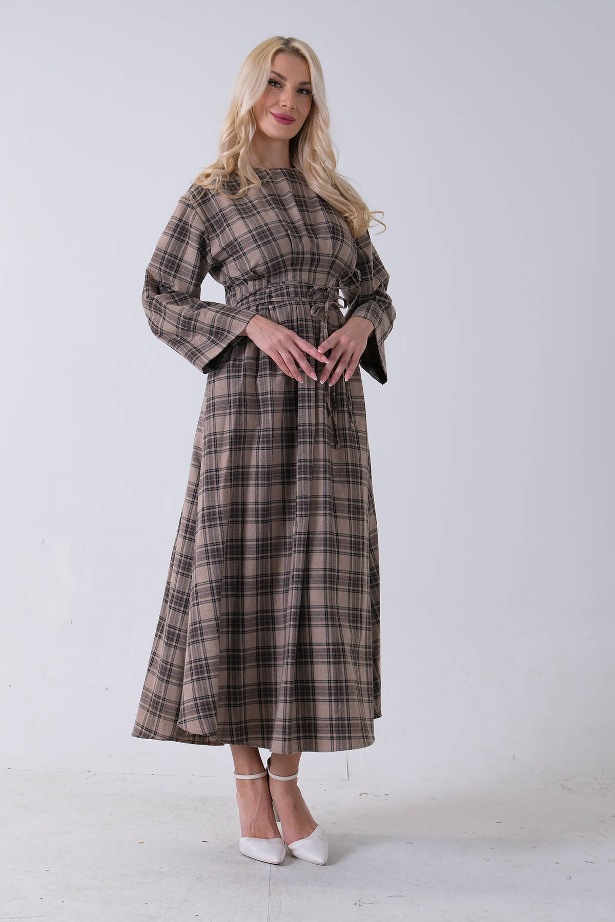 Vizon Bisiklet Yaka Ekose Desenli Bel Bağlamalı Tesettür Elbise 4593460.34