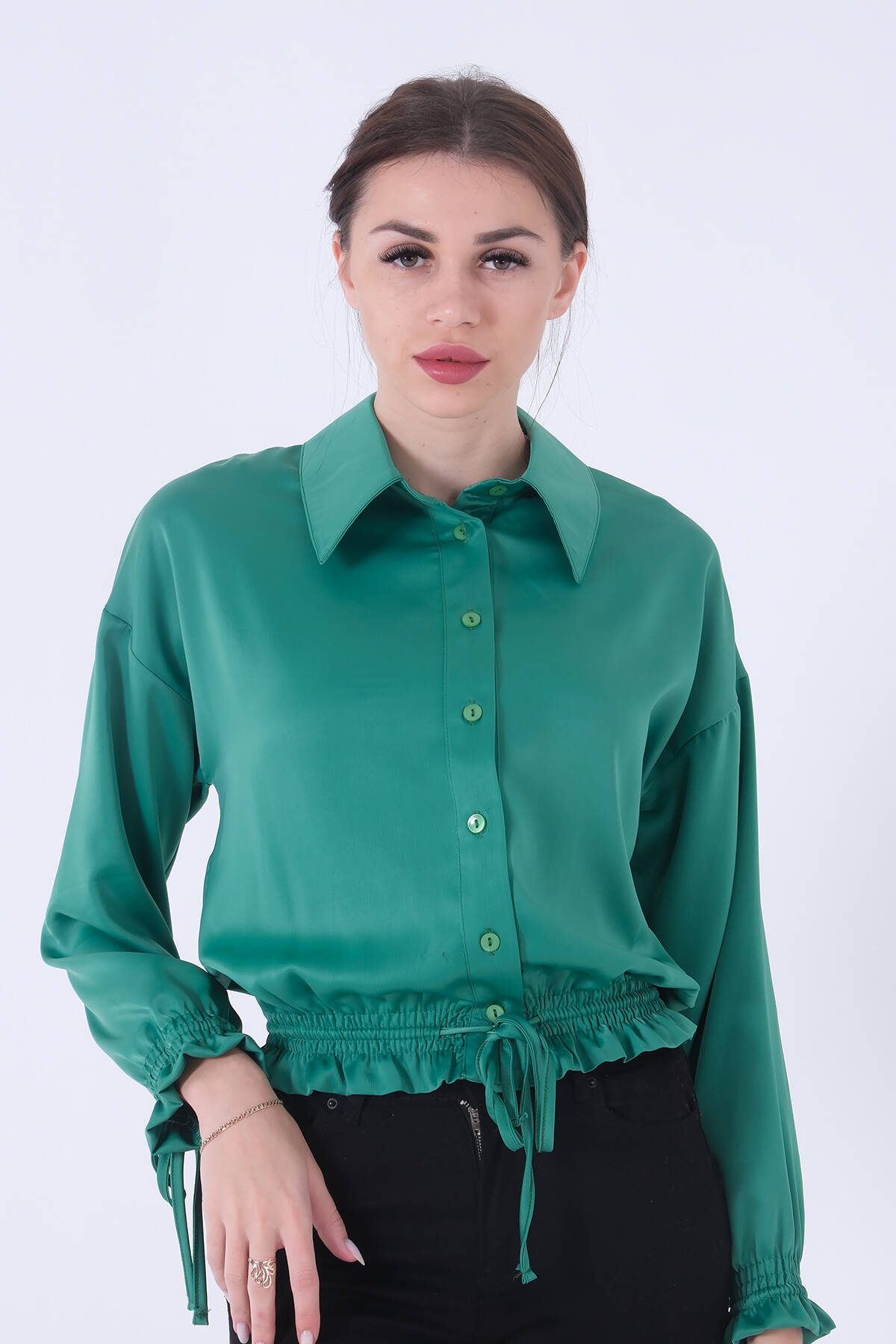 Yeşil Bel ve Kol Ucu Gipe Detaylı Saten Gömlek 3972863.07