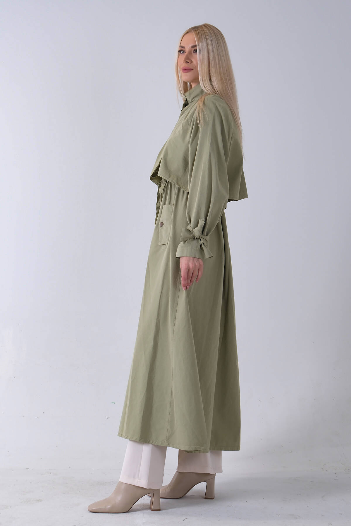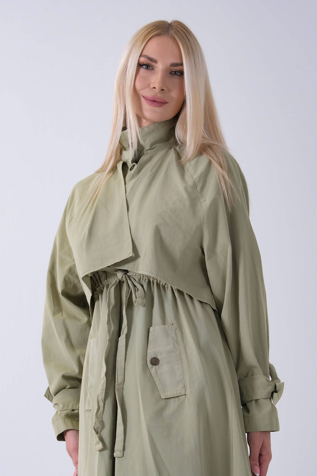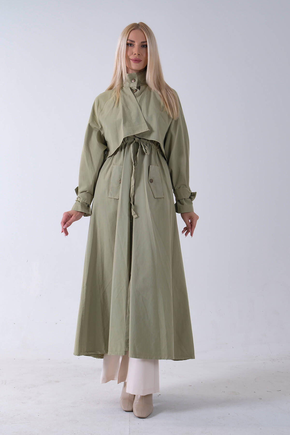 Yeşil Belden Bağlama Detaylı Yandan Cepli Uzun Trenç 422237.07
