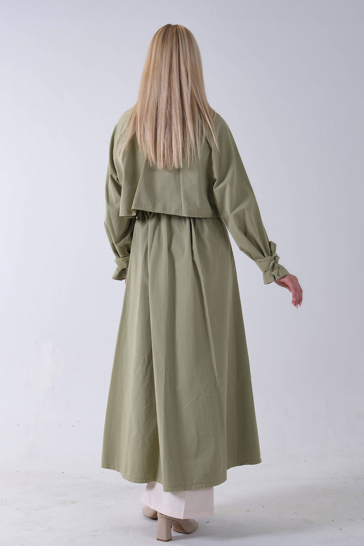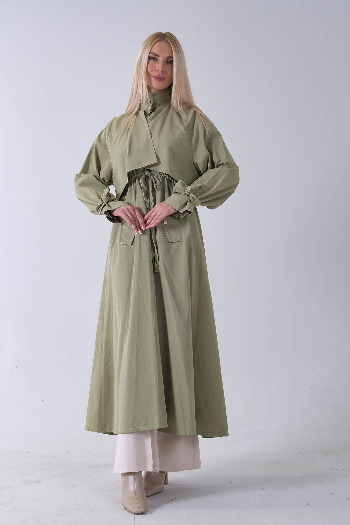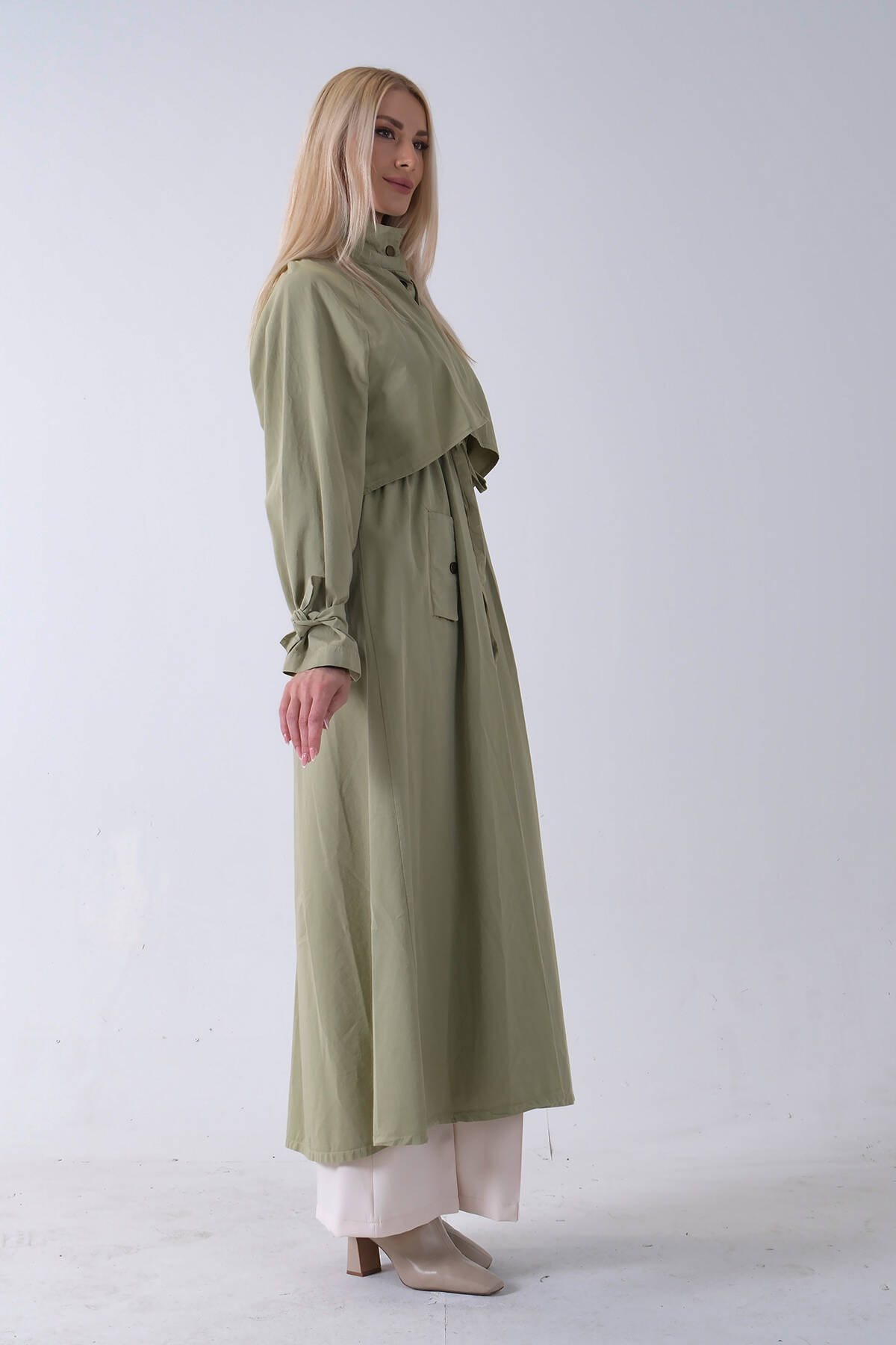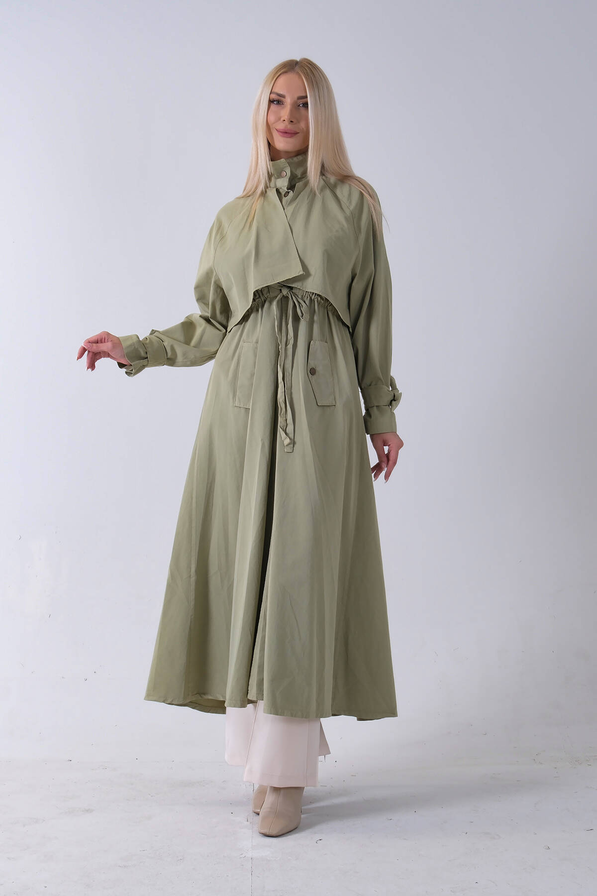 Yeşil Belden Bağlama Detaylı Yandan Cepli Uzun Trenç 422237.07