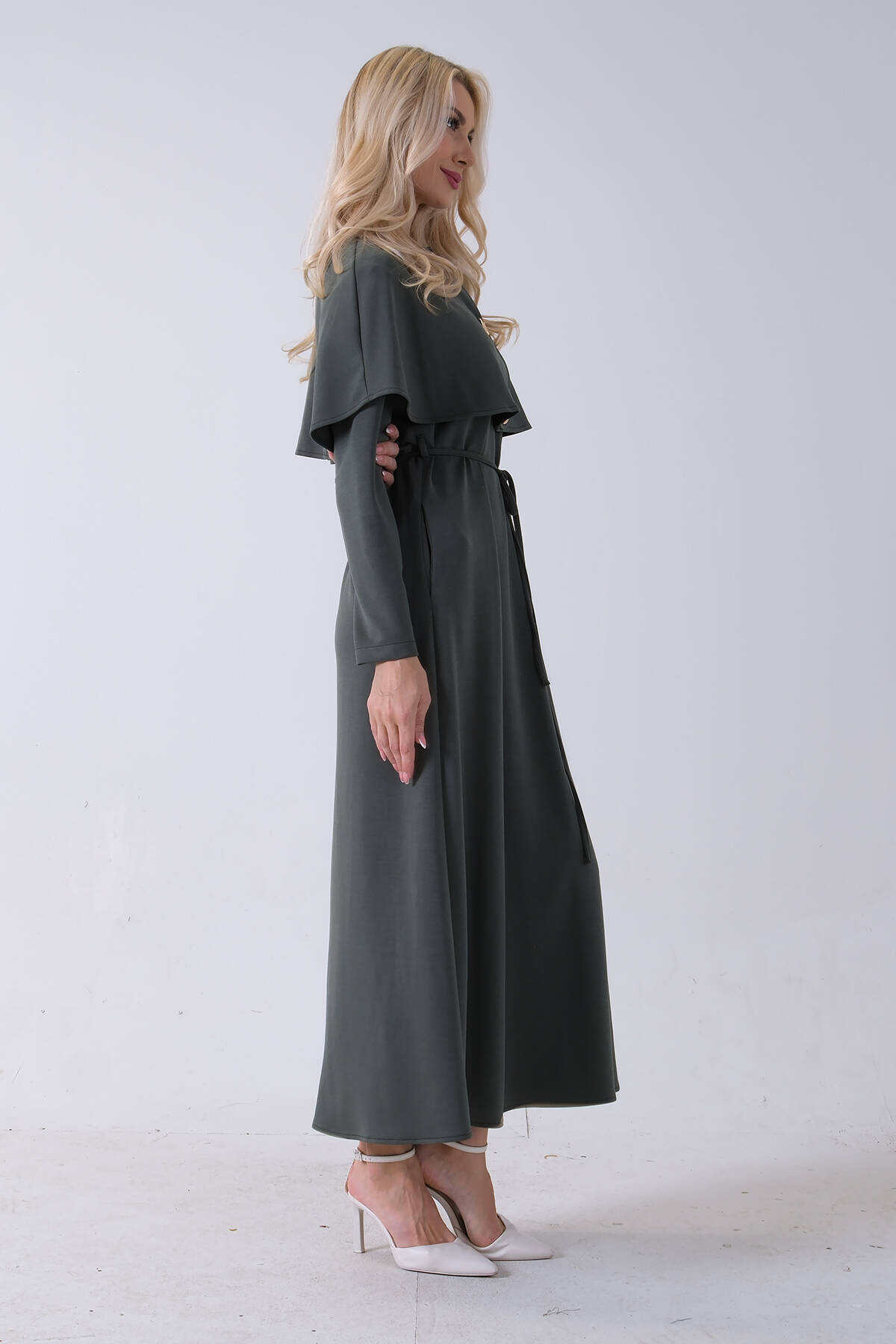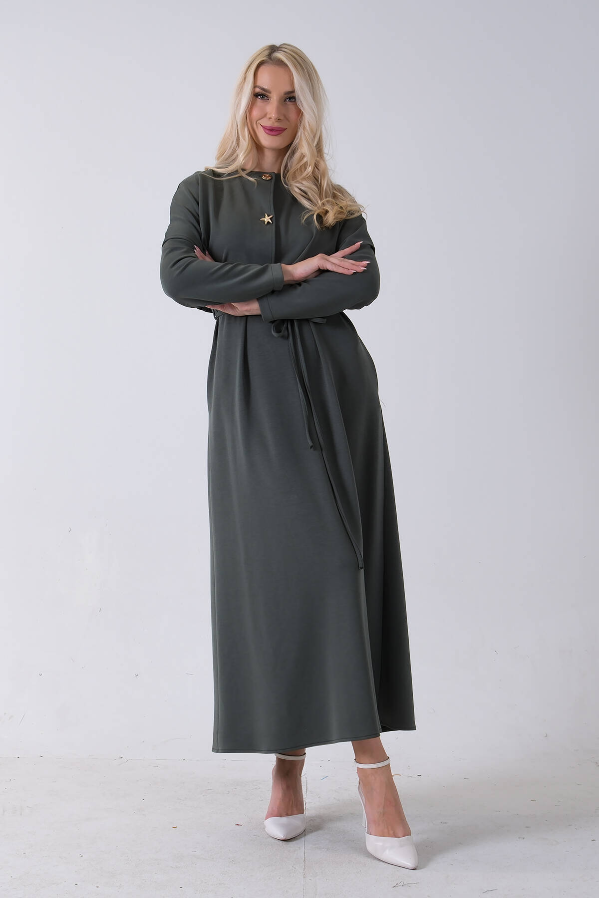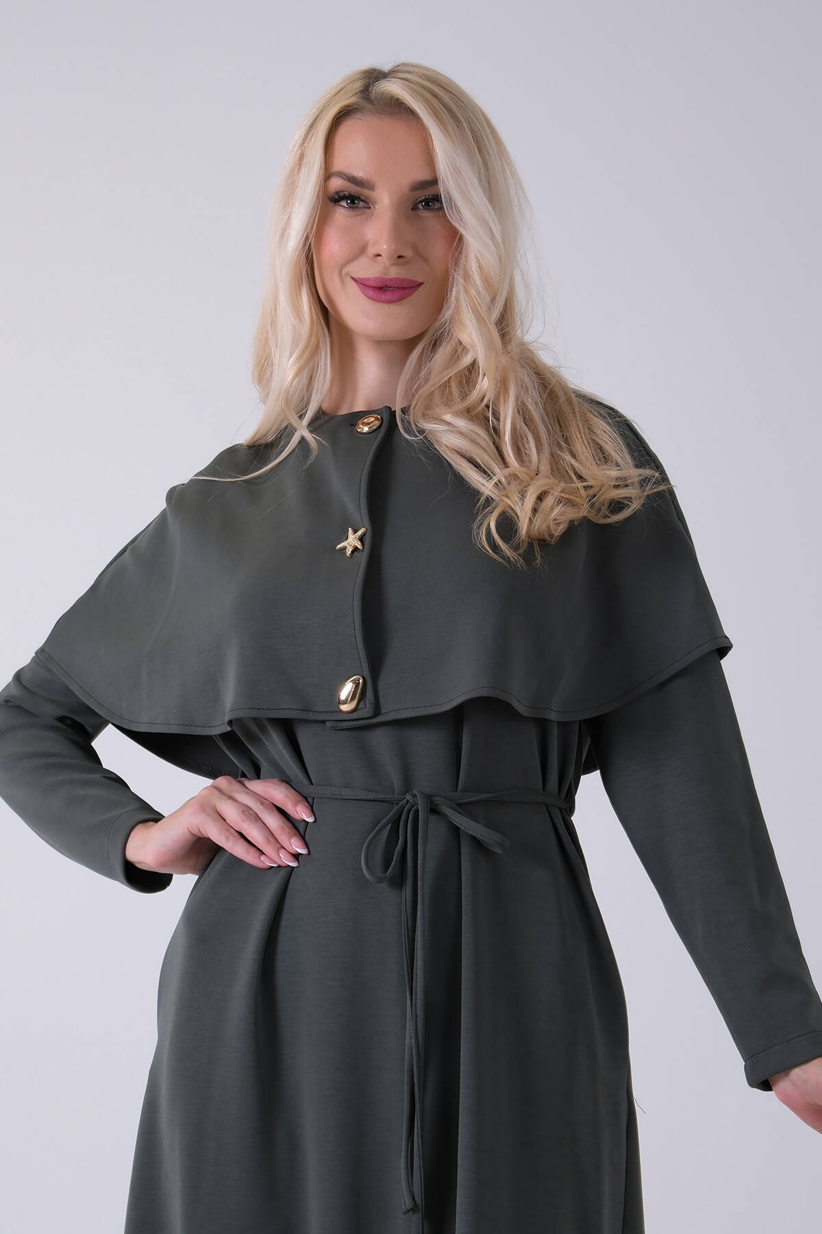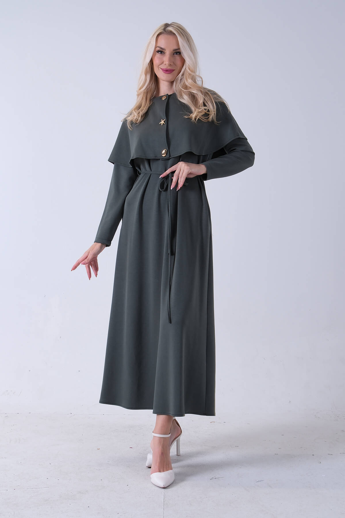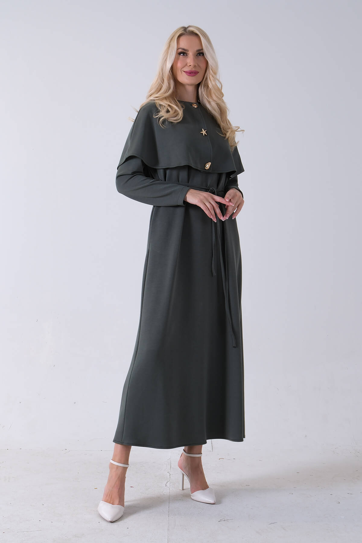 Haki Boydan Düğme Kapamalı Bileği Lastikli Beli Kemerli Elbise 4593459.23