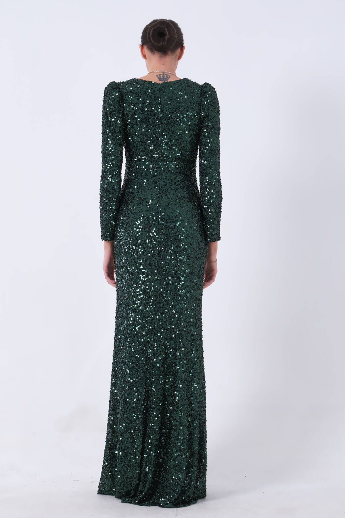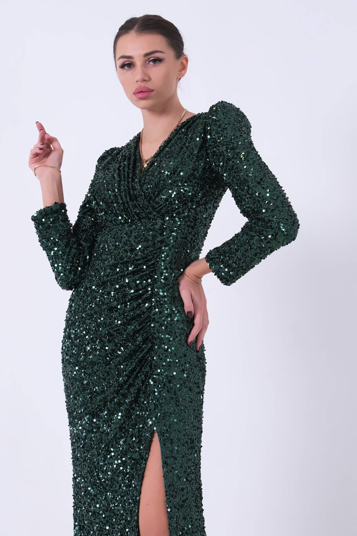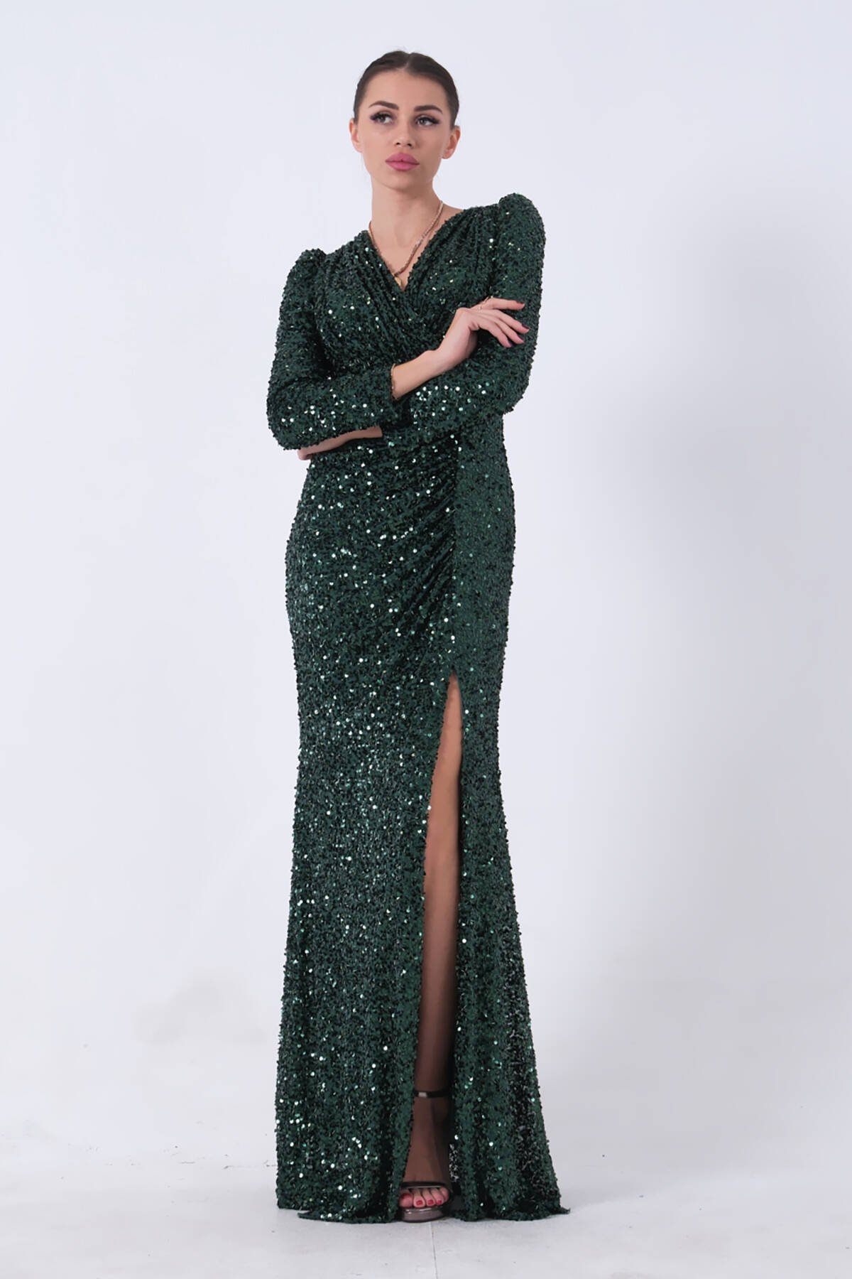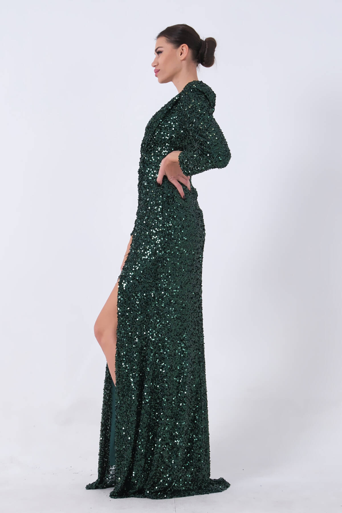 Zümrüt Pul Payetli Drapeli Önü Yırtmaçlı Abiye 9705393.123