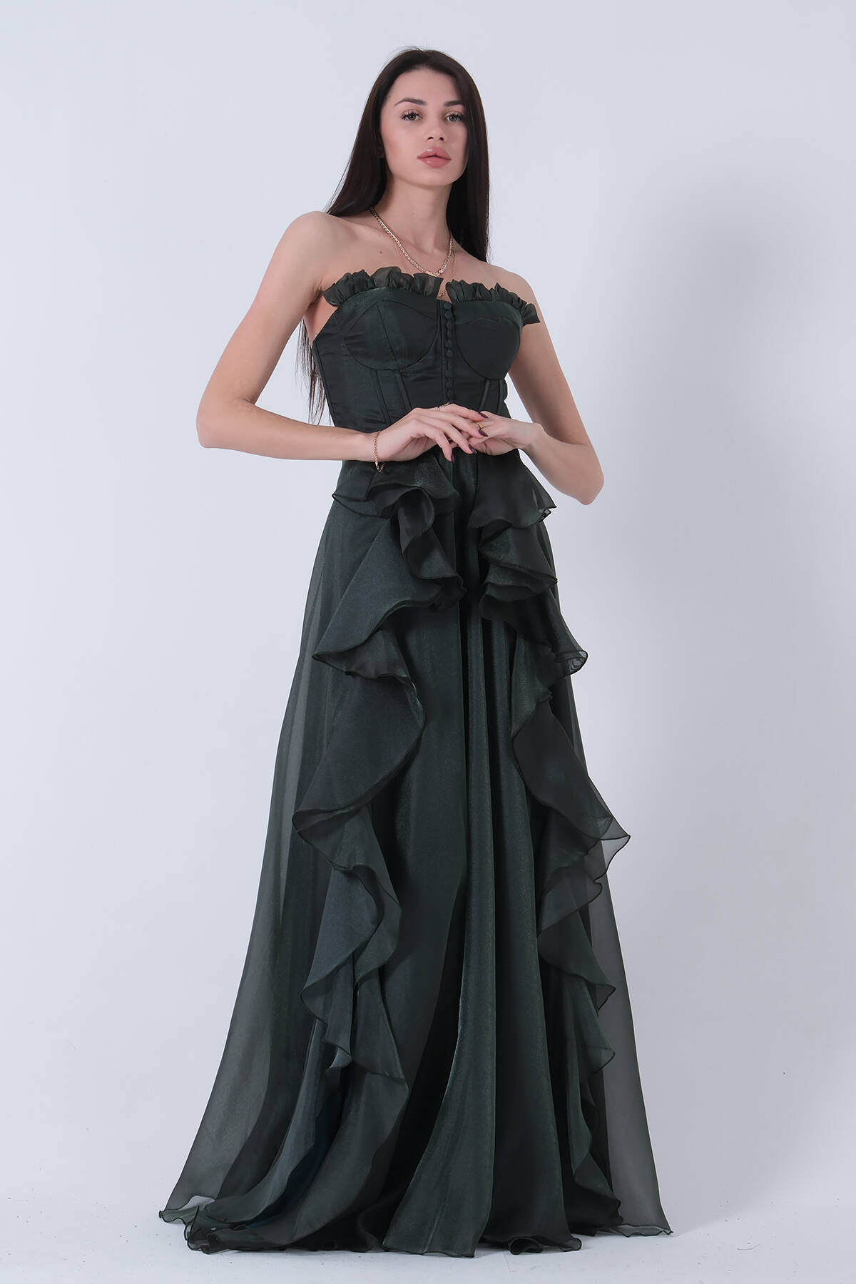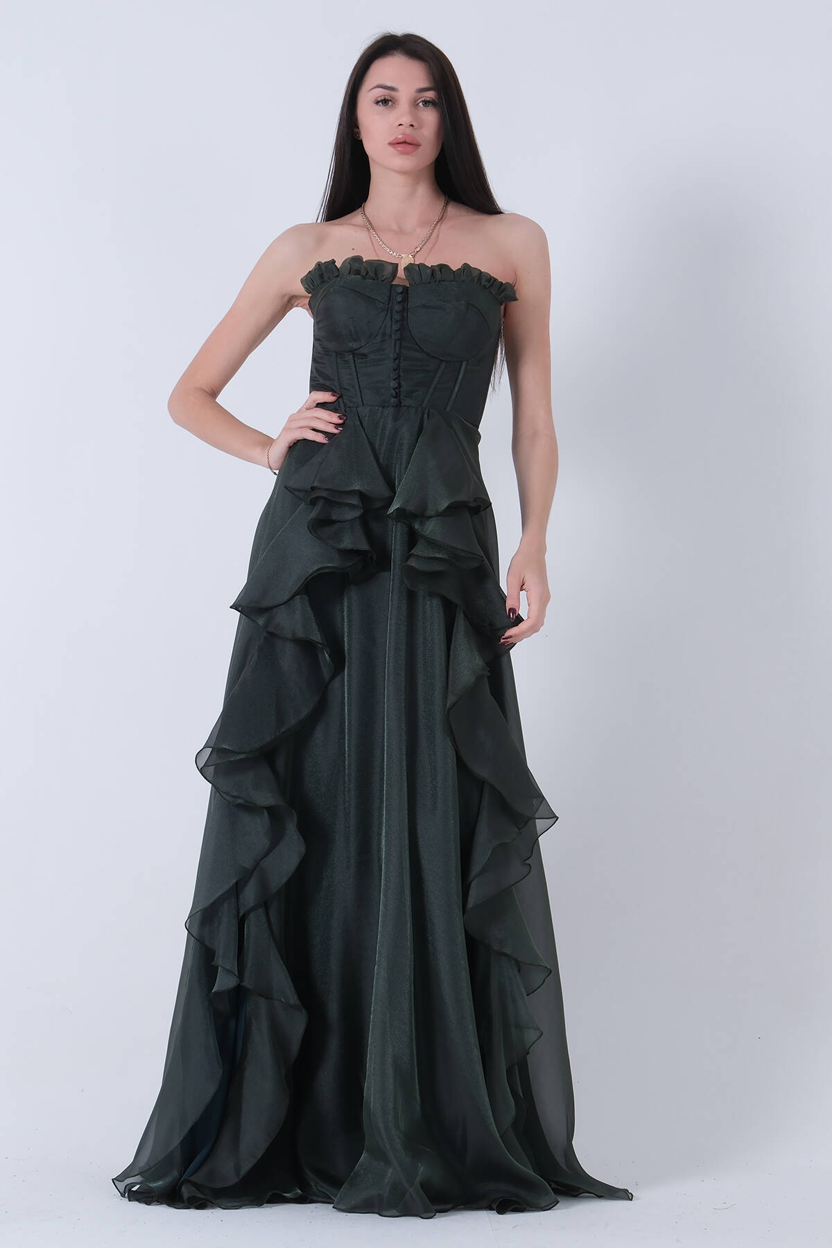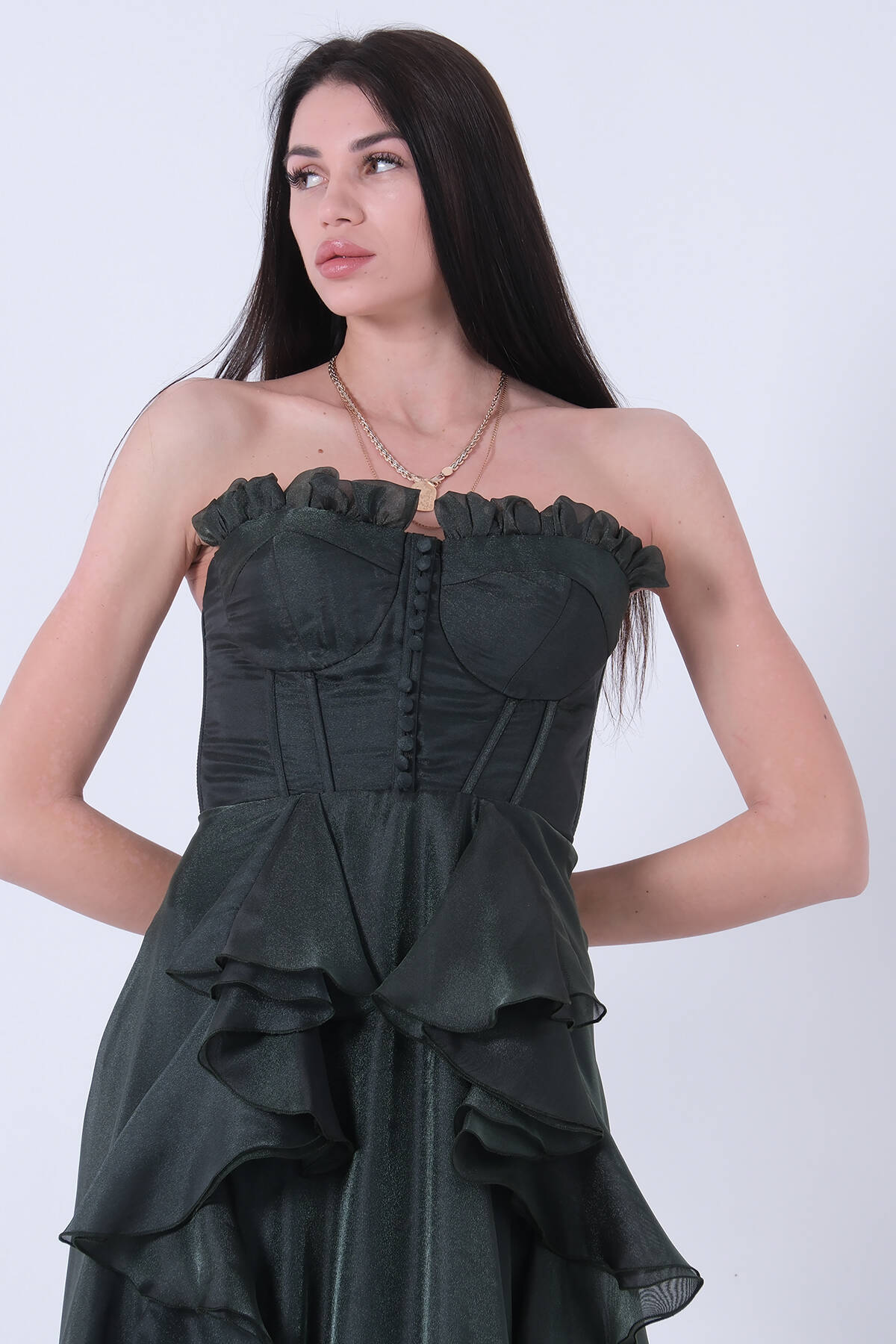 Zümrüt Straplez Yaka Yırtmaçlı Eteği Fırfırlı Abiye 9705234.123