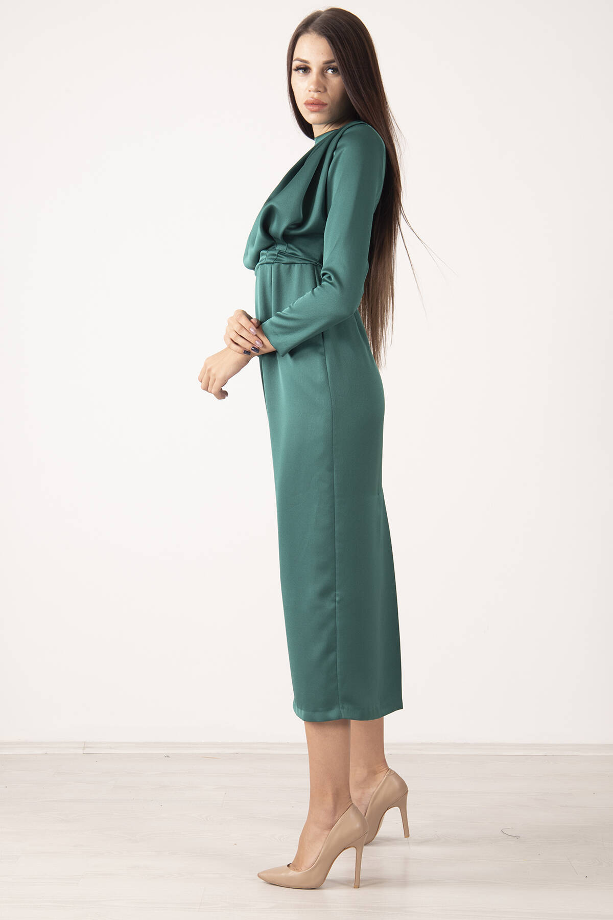 Modelin Ölçüleri : Boy: 1.75 cm / Göğüs: 87 cm / Bel: 66 cm /Basen : 94 cm Mankenin Üzerindeki Ürün 36/S Bedendir %100 Polyester Uzun Kol Omuzu Vatkalı Bisiklet Yaka Üzeri Plise Detaylı Astarlı Saten Abiye Elbise Ürün Boyu: 131 cm Stüdyo Çekimlerinde Renkler Işık Farklılıgından Dolayı Değişiklik Gösterebilir. (Dikkat! Ürünlerimiz güvenlik bandı ile gönderilmektedir . Güvenlik bandı olmayan ürünlerin iadesi kabul edilmeyecektir)