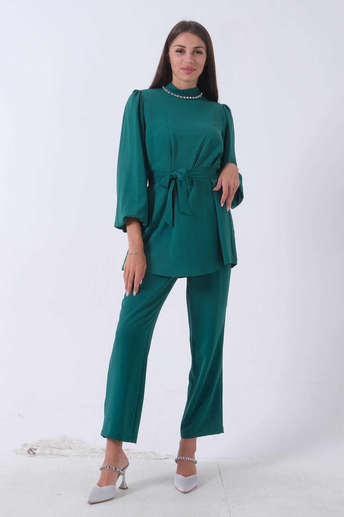 Zümrüt Yakası Taş Detaylı Balon Kol Pantolonlu Takım 46320011.123