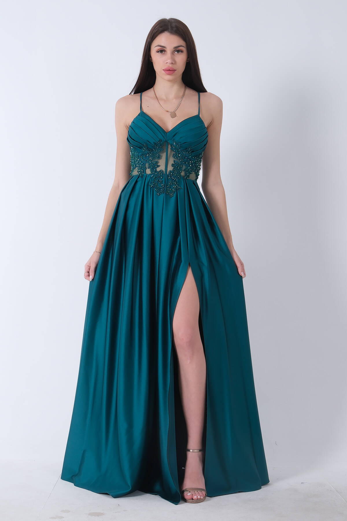 Zümrüt Yırtma Detaylı İp Askılı Saten Abiye Elbise 9704981.123